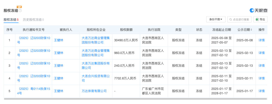 具体来看,除前述新增外,2月13日,其持有的万达商管集团960万元股权,以及大连万达集团240万元股权均被冻结;2月11日,其持有的大连合兴投资有限公司7702.8万元股权被冻结;1月,其持有的万达体育有限公司5000万元股权被冻结。