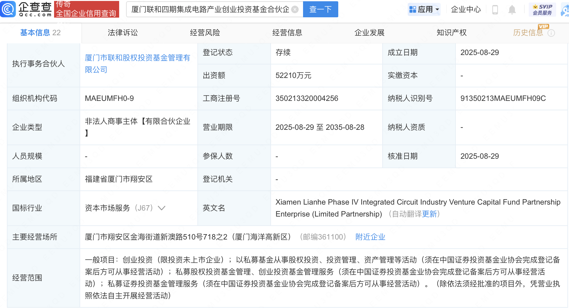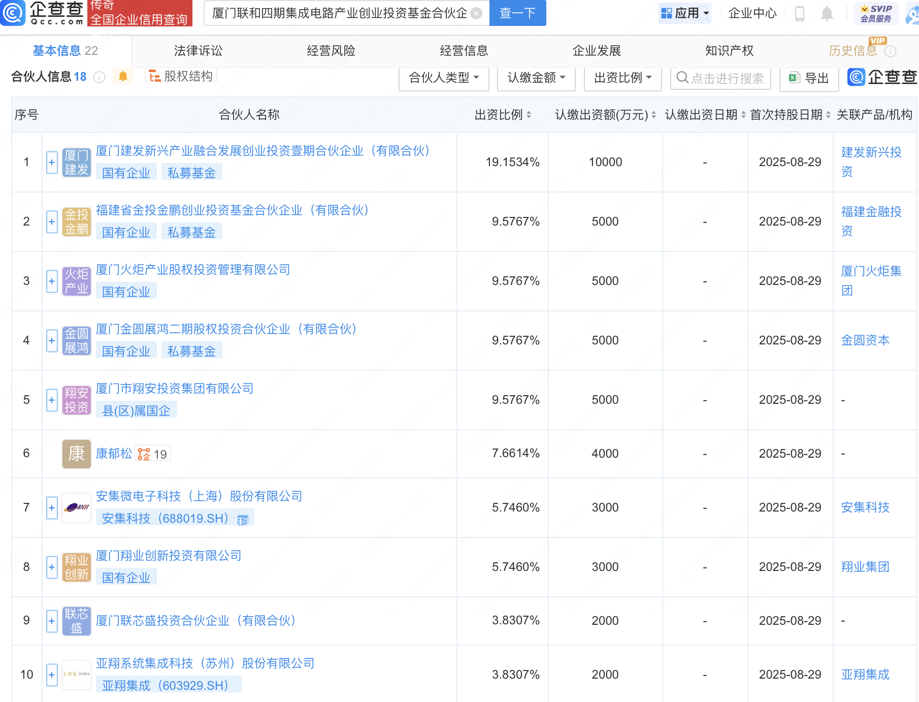 近日,厦门联和四期集成电路产业创业投资基金合伙企业(有限合伙)成立鸿牛配资,出资额5.22亿元,经营范围包含:以私募基金从事股权投资、投资管理、资产管理等活动。企查查股权穿透显示,该企业由安集科技(688019)、亚翔集成(603929)等共同出资。