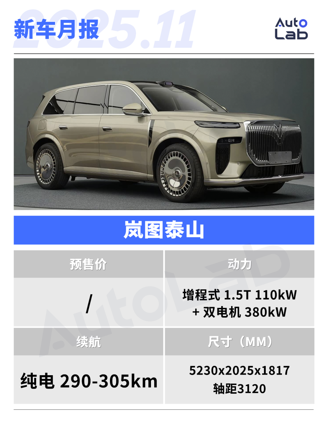 动力上,岚图泰山将搭载“岚海智能超混”技术,拥有65度大电池,纯电续航370km,综合续航1400km。