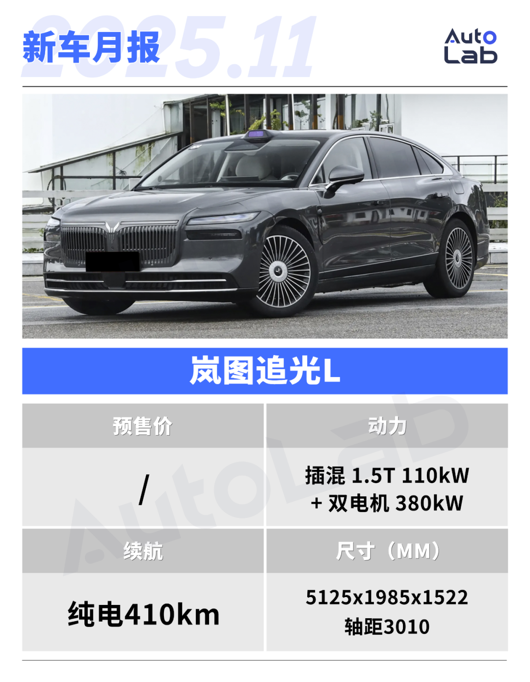 岚图追光L定位中大型插混轿车,它基于800V高压平台打造,匹配63度5C电池,纯电续航来到了410km;同时其在底盘部分还配备了双腔空气悬架和后轮转向系统。